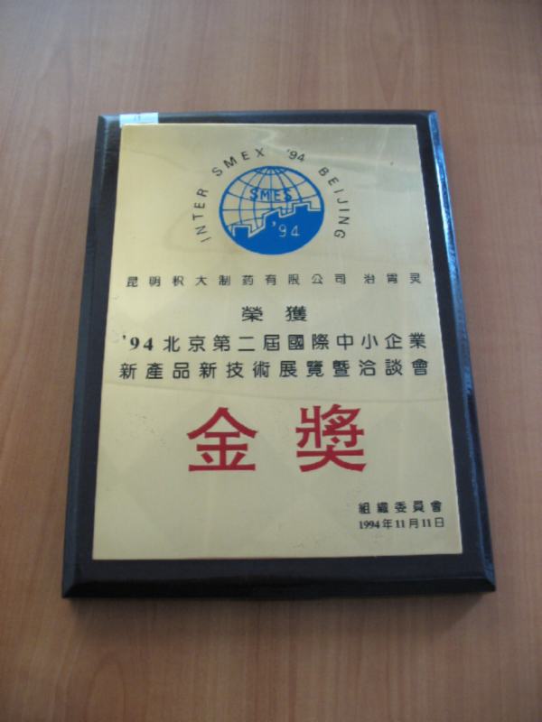 1994年11月11日,治胃靈(鉍鎂碳酸氫鈉片)榮獲`94年北京第二屆國(guó)際中小企業(yè)新產(chǎn)品新技術(shù)展覽及洽談會(huì)金獎(jiǎng)。
