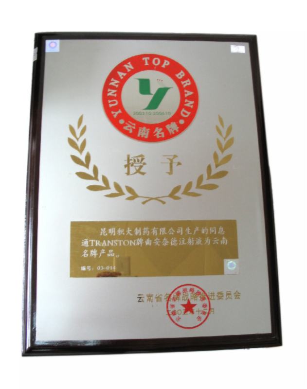 2003年10月,云南名牌戰(zhàn)略推進(jìn)委員會(huì)將同息通TRANSTON(曲安奈德注射液)評(píng)為云南名牌產(chǎn)品。