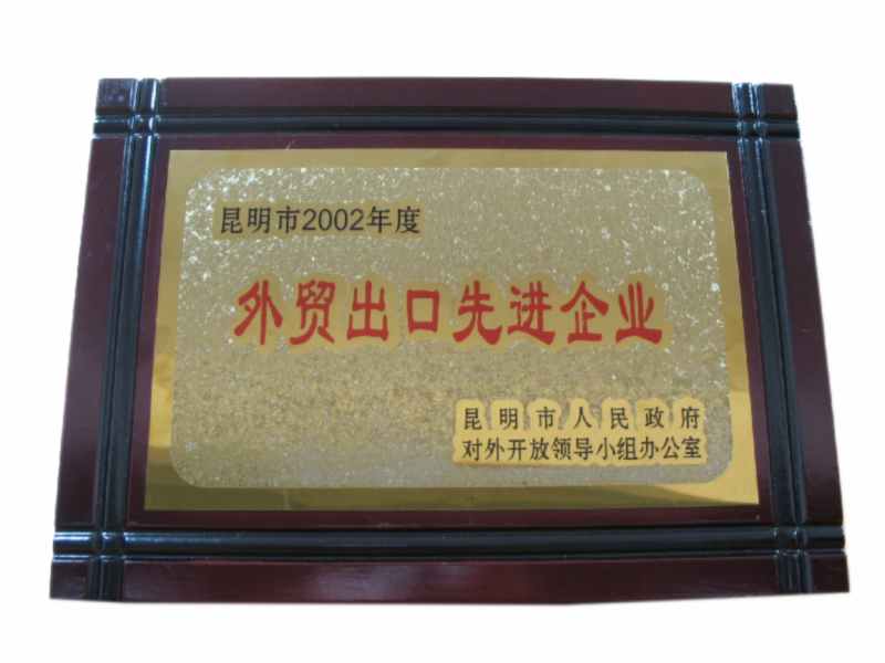 昆明市人民政府對外開放領導小組辦公室授予昆明市2002年度外貿出口先進企業(yè)。